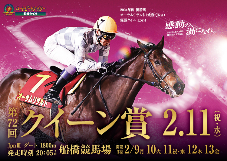 船橋競馬場で行われる、牝馬たちによるハンデキャップレースです。 全日本的なダート競走体系の整備に伴い、2024年から開催時期が11月から2月へと移行し、新たなスタートを切りました。これまで新年の牝馬ダートグレードといえば大井競馬場の「TCK女王盃(JpnIII)」が広く親しまれてきましたが、同競走は園田競馬場へ移転し、兵庫女王盃として実施されています。 この変更により、クイーン賞は年明け最初に行われる牝馬ダートグレード競走として、重要なオープニングカードの役割を担うこととなりました。また、本競走を制した地方所属馬には、「エンプレス杯(JpnII)」への優先出走権が付与されることから、冬のダート女王を決める一戦として、その注目度は以前にも増して高まっています。